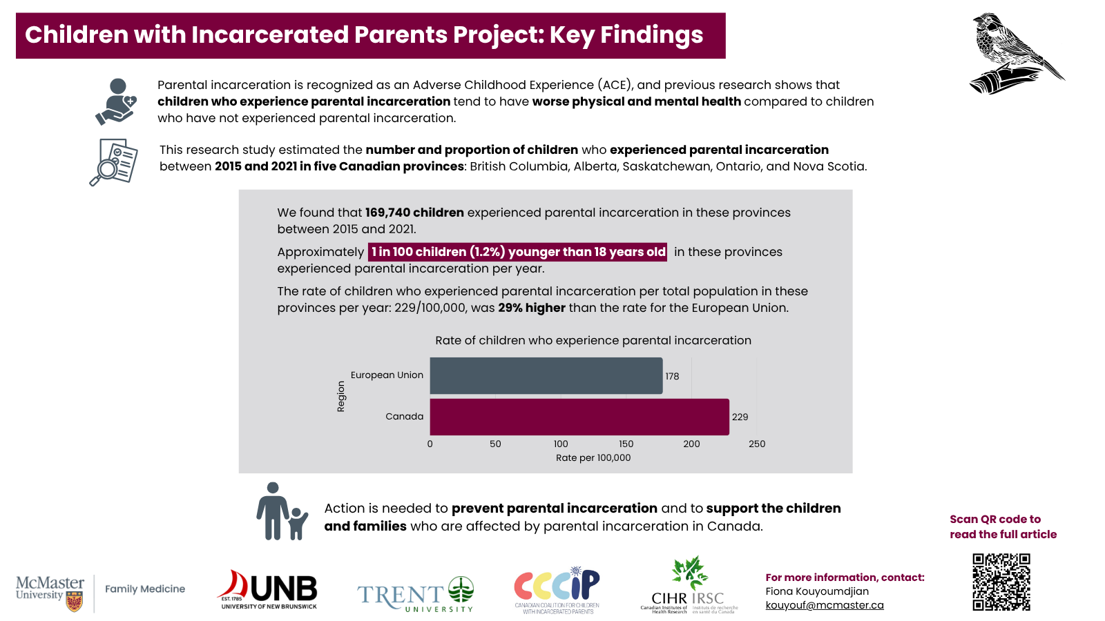- Kouyoumdjian F.G., Paynter M., Knudsen E.M., Croxford R., Bondy S.J., Jennings L., Russel N., Semeniuk R., Bentley-Wang C., Butler, A., Butsang T., Catherine N.L.A., … & Sharma S. (2026) Estimating the number and percentage of children who experience parental incarceration in Canada using whole population administrative and vital statistics data. PLoS One 21(4): e0344941. https://doi.org/10.1371/journal.pone.034494